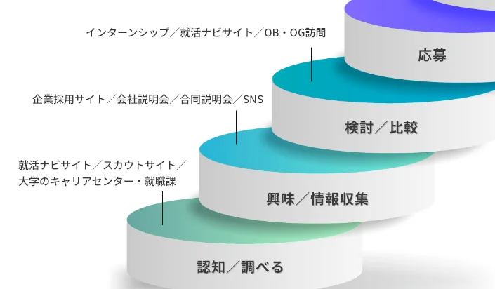 | 認知 | 知りたい | 業界研究、サイト登録 | 就活ナビサイト/スカウトサイト/大学のキャリアセンター・就職課 |